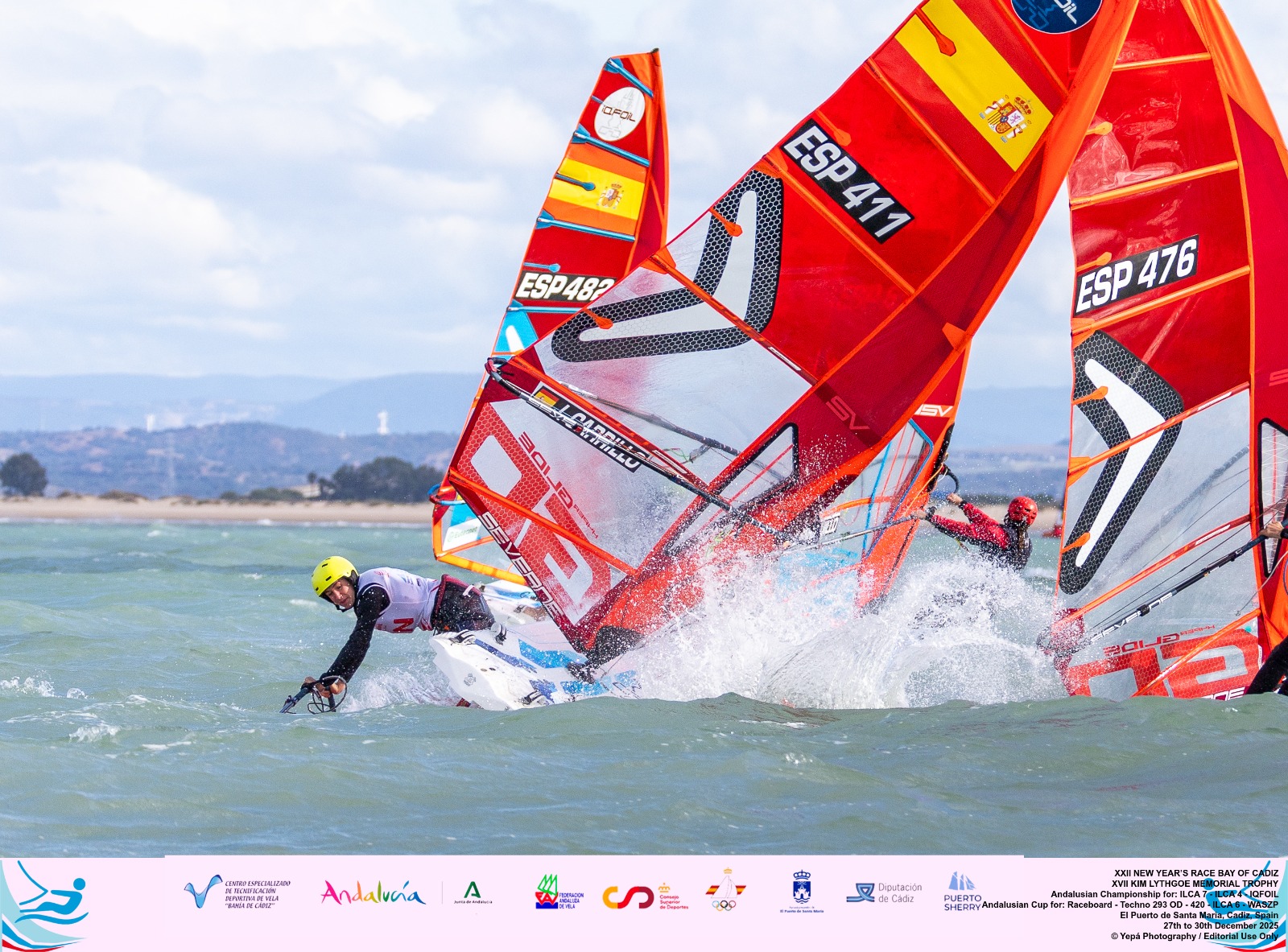 La 22ª Regata de Año Nuevo, Memorial Kim Lytghoe, ha iniciado hoy domingo su competición en la Bahía de Cádiz con una primera jornada tan espectacular como exigente. Las duras condiciones -con mucha mar de fondo y vientos del S-SE de 15/18 nudos con rachas que han llegado a 23- han puesto a prueba a los más de 200 regatistas presentes en esta última regata del año, distribuidos en tres grandes áreas: una destinada a las clases ILCA, otra para Techno y Raceboard, y la tercera para la tabla olímpica iQFOil y la clase Waszp.